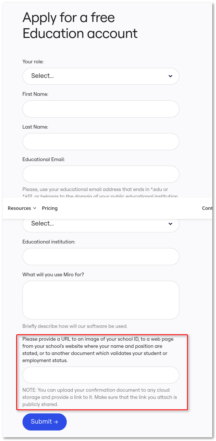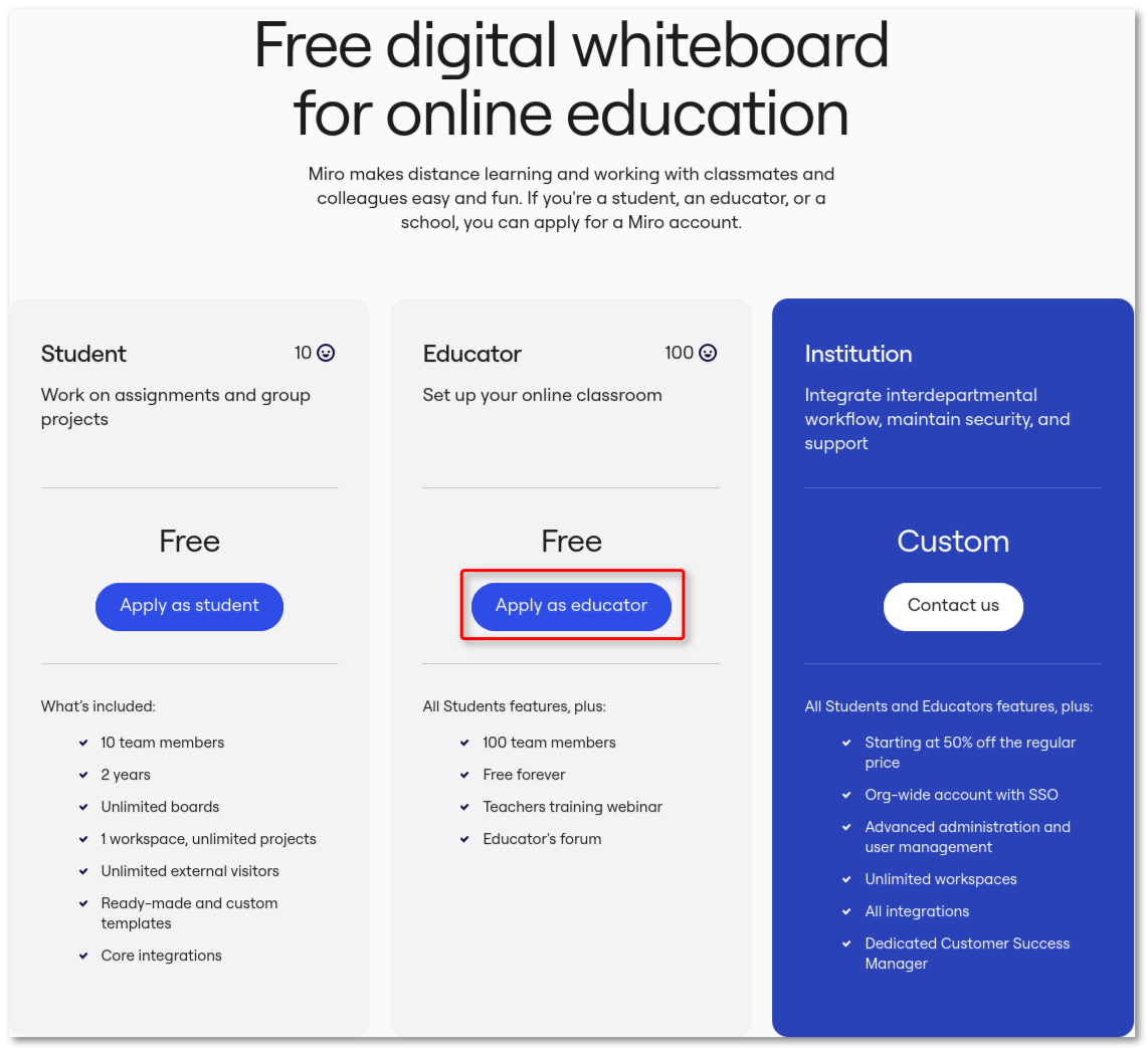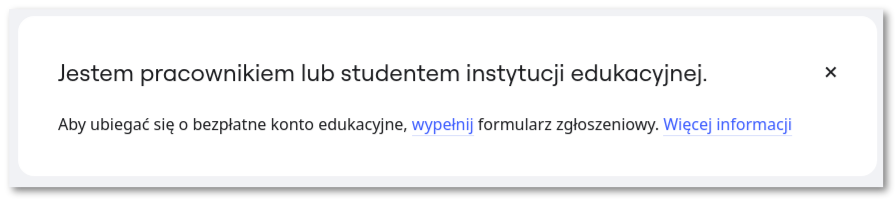 Po przejściu do strony z planami abonamentowymi miro należy przewinąć stronę do samego dołu, by znaleźć listę FAQ a w niej wpis: „Jestem pracownikiem lub studentem instytucji edukacyjnej”. Tutaj trzeba przejść do wypełnienia formularza zgłoszeniowego.
