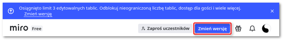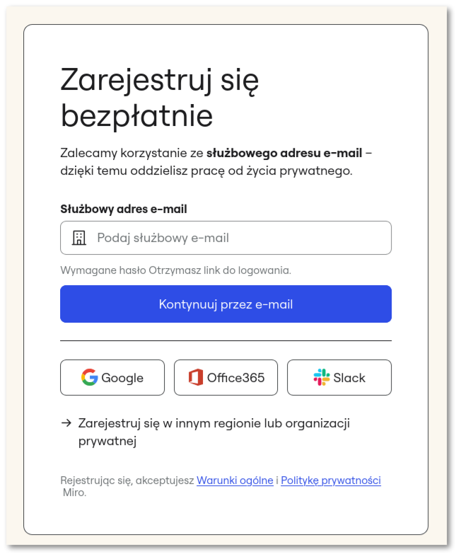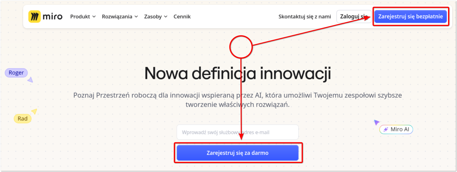 Zakładanie konta edukacyjnego premium w Miro.com jest dość skomplikowane. Serwis narzuca się na każdym kroku z opcją rejestracji. Klikamy jeden z niebieskich przycisków „Zarejestruj się bezpłatnie” znajdujących się na stronie miro.com.