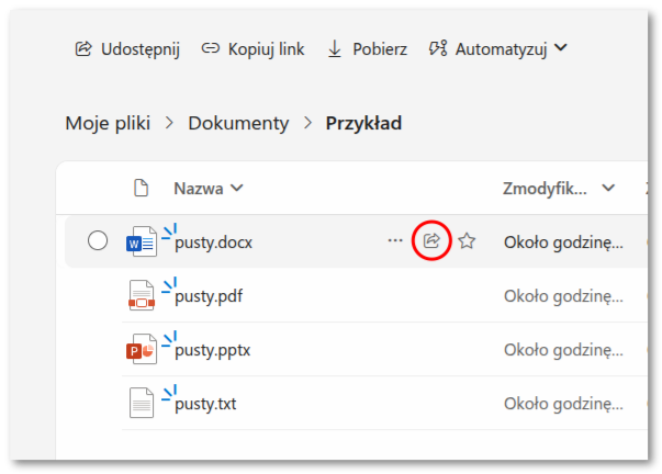 Usługa OneDrive umożliwia udostępnianie studentom i pracownikom / nauczycielom plików o znaczących rozmiarach. Odnośniki do udostępnianych plików można bez problemu wstawiać do kursu w Moodle. Najpierw trzeba wygenerować odnośnik do pliku, który ma zostać udostępniony. Przy każdym pliku w OneDrive, po najechaniu kursorem myszy wyświetla się symbol udostępniania.